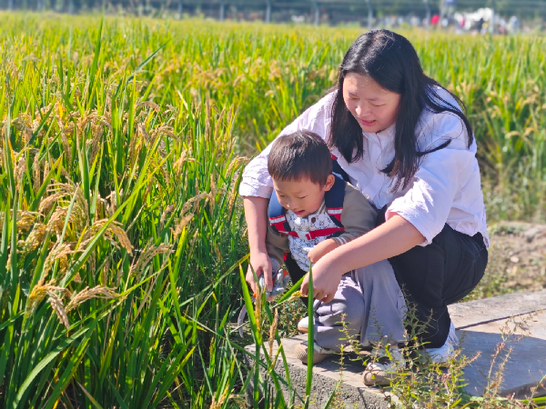 金灿灿的稻田,原来是秋姑娘带来的最大宝藏!我们和爸爸妈妈一起,握住了沉甸甸的稻穗,一下,两下,哈哈,我们成功啦!原来我们每天吃的香喷喷米饭,就是这样来的呀,真是太神奇了