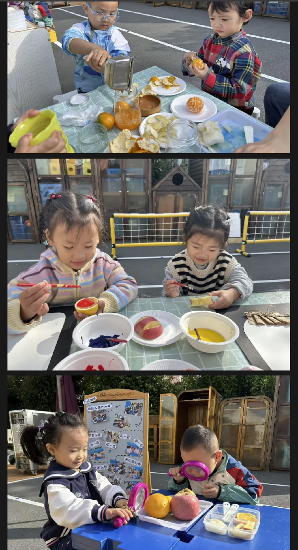 秋天是个香香甜甜的季节!星星1班变成了一个水果乐园,孩子们用小手剥橘子、用水果盖印章、还开了果汁店!在好玩儿的游戏中,我们认识了秋天的好多水果,发现了好多小秘密呢!