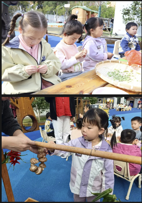 星星2班的孩子们迎来了秋日大丰收,胖乎乎的小手认真地剥开毛豆,把香菇串成项链;用莲藕、青菜蘸上颜料,在白布上印出朵朵秋色;还用彩泥捏出各种果蔬形状。原来“晒秋”这么有趣!