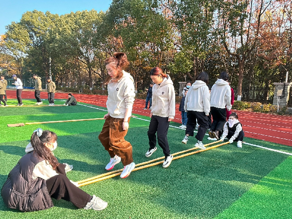 “开合,开合,开开合合!”老师们紧紧跟着口号与竹竿的节拍,双脚齐落,脸上洋溢着紧张又兴奋的笑容。当传统民俗遇上现代竞技,碰撞出的不仅是欢乐的火花,更是教育者传承与创新并重的教育智慧。