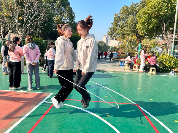 预备——跳!随着清脆的哨声,两组老师化身默契搭档,短绳在空中划出银色弧线。她们时而同步腾空,时而交错跃动,用轻盈的身姿诠释“1+1>2”的团队哲学。绳影翻飞间,不仅跳出了健康活力,更跃出了教育者携手同行的坚定信念。