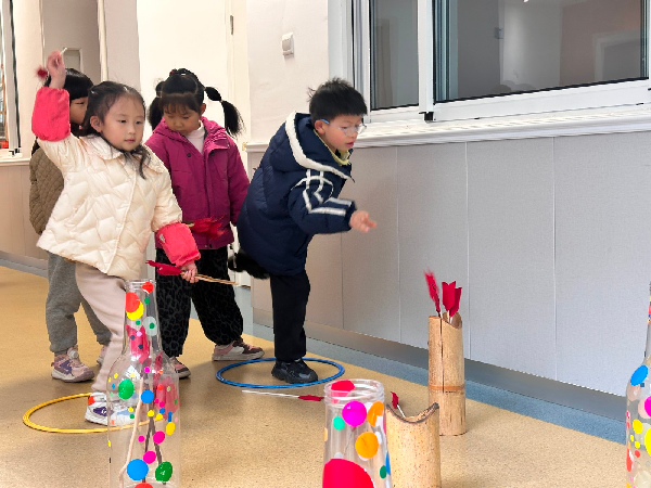 “准备好了吗?”只见孩子们站在基准线上,手拿“五支箭”预备,每个人都聚精会神,想要跃跃欲试,“开始~~”