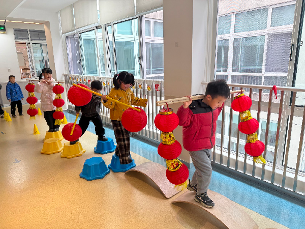 最热闹的要数“挑灯笼运元宵”游戏了!孩子们挑着扁担,挂着灯笼,走过独木桥、绕过梅花桩,在保持平衡的同时将“元宵”安全送达。“小心小心!”“我过去啦!”欢叫声此起彼伏。