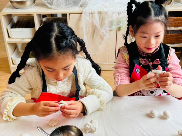 “先搓圆,再压扁,放上馅,包起来……”小御厨里,孩子们系上小围裙,有模有样地包起汤圆。