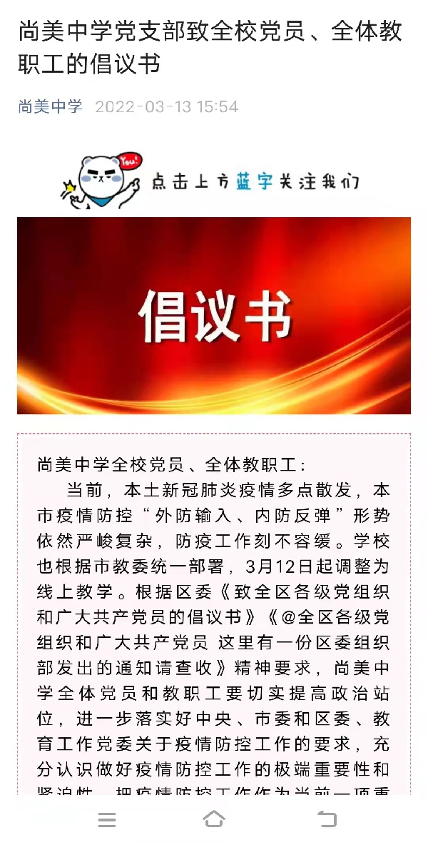 当战“疫”的号角再次响起,我们的书记第一时间发出《尚美中学党支部致全校党员、全体教职工的倡议书》,成立尚美中学党员防疫突击队,他本人带头加入教育系统疫情防控志愿者队伍,是所在小区居委第一位报名志愿服务的居民。