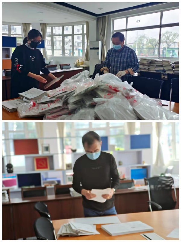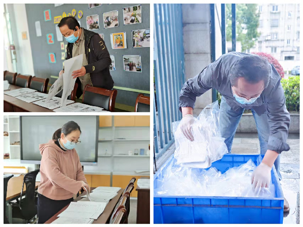 学校也为八、九年级的尚美学子印发试卷,行政老师、后勤人员等自愿接龙,整理、装袋、发放,默默无闻,护航成长。