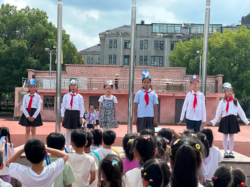 12点10分伴随着激昂的中国少年先锋队队歌,启动仪式正式拉开帷幕。全体师生肃立注目,中国少年先锋队队旗在阳光中熠熠生辉,孩子们挺直的小身板、专注的眼神,彰显着对校园与先锋队的崇敬。队歌合唱完后,苗苗章小演员上台表演,用活泼易懂的歌谣向全体一年级新生介绍苗苗章的意义与获取方式。