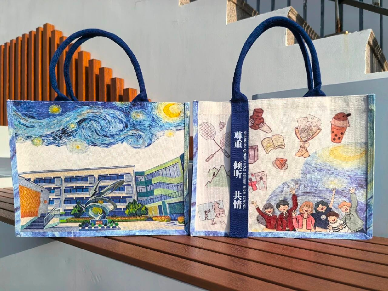 经过班级初评与学校综合筛选,从作品中遴选最具代表性的设计,巧妙结合学校教学楼等标志性建筑特点进行优化整合,将其印制成独具校园特色的文创“托特包”。活动当天,这款承载着学生创意与校园文化的文创袋被作为专属资料袋发放给前来参加听课的老师们,既展现了我校学生的艺术素养与创新能力,也让参会者在细节中感受到学校对心理健康教育的用心与温度。