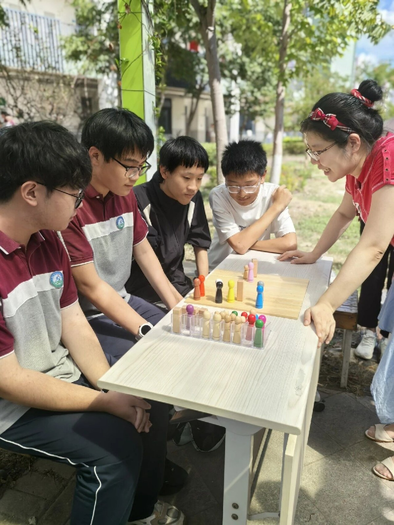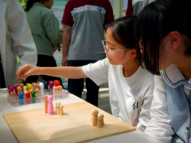 “心理格盘体验”活动以可爱木制人偶为核心道具,助力学生探索人际关系。学生在格盘上摆放代表自己与好友、同学、家人等人偶,通过调整人偶距离直观感受人际距离变化,分享内心感受时思考优化人际的方法。在与心理钱老师深度对话及挪动人偶的互动中,同学们重新体验家庭关系状态,尝试新视角塑造和谐联结。现场氛围热烈,大家也感受到人际交往中的温暖与力量。
