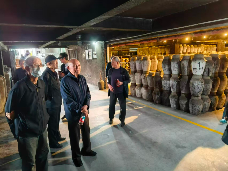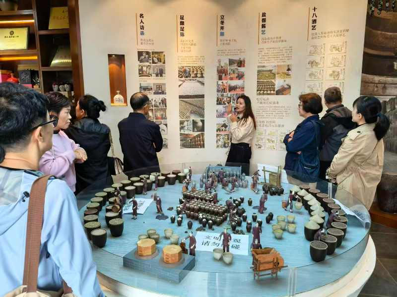 上午,退休教师们首先抵达沈荡酿造厂。这座始建于1887年的"中华老字号"企业,前身为泰兴酱园,如今已入选浙江省首批工业遗产名录。在讲解员引导下,老师们参观了保存完好的遗产厂房,近距离端详清代至民国时期的近万个黄酒陶坛,聆听老账本、旧厂牌等珍贵物件背后的历史故事,深入了解传统酿造技艺的传承与发展。当看到1978年建成的老办公楼门头按老照片复原的细节,以及见证百年匠心的清代木榨机时,老教师们不时驻足感慨,对工业遗产活化利用的成果赞叹不已。