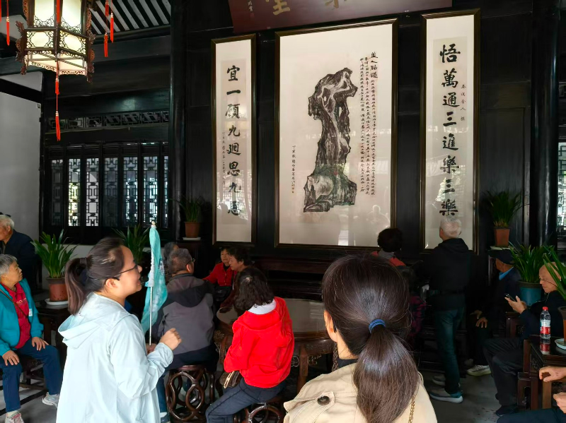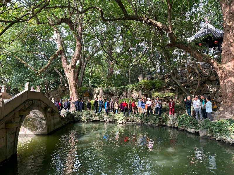 午后,老师们前往绮园游览。这座原为"冯氏花园"的江南名园,占地10000平方米,以"水随山转,山因水活"的造园艺术著称,兼收苏、扬、杭园林之长。漫步园中,四十余株百年古树名木亭亭如盖,九曲桥横跨碧波,潭影轩掩映在绿荫之中,"绮园十景"的诗意景致让老师们沉醉其间。大家或驻足欣赏太湖石"美人照镜"的奇趣,或在罨画桥畔合影留念,在清新秋风中畅谈往昔校园岁月与退休生活点滴。