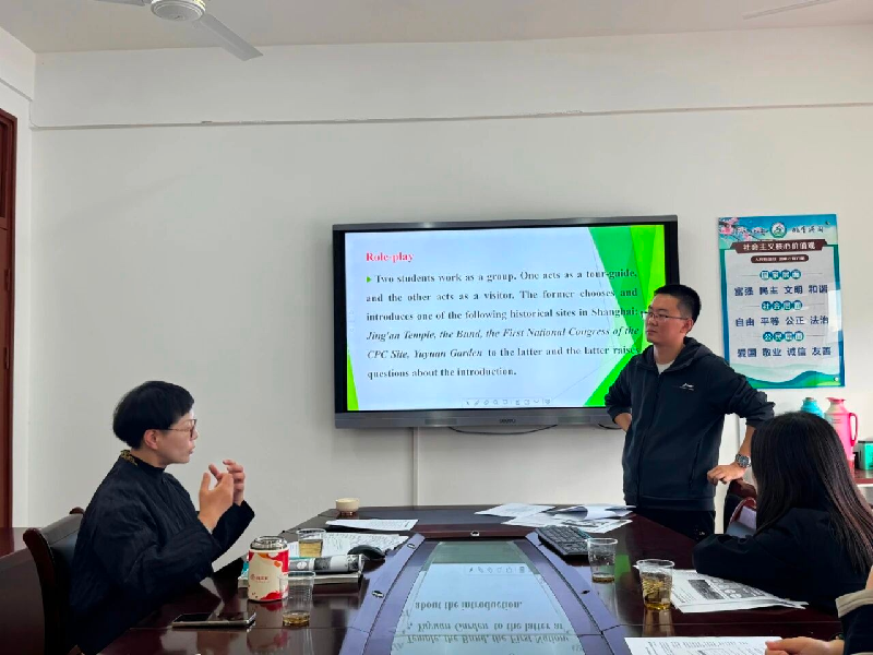 分享会最后,团队成员王建老师围绕“上外选择性必修四Unit 3 Listening and Speaking”展开说课,从教学目标设定、POA“驱动—促成—评价”环节设计、学情适配策略等方面,详细讲解课例思路。其他成员结合理论学习心得,对说课内容提出补充建议,进一步完善课例设计,确保11月12日的团队课例实践与研讨能精准落地,切实检验POA理论在课堂中的应用效果。