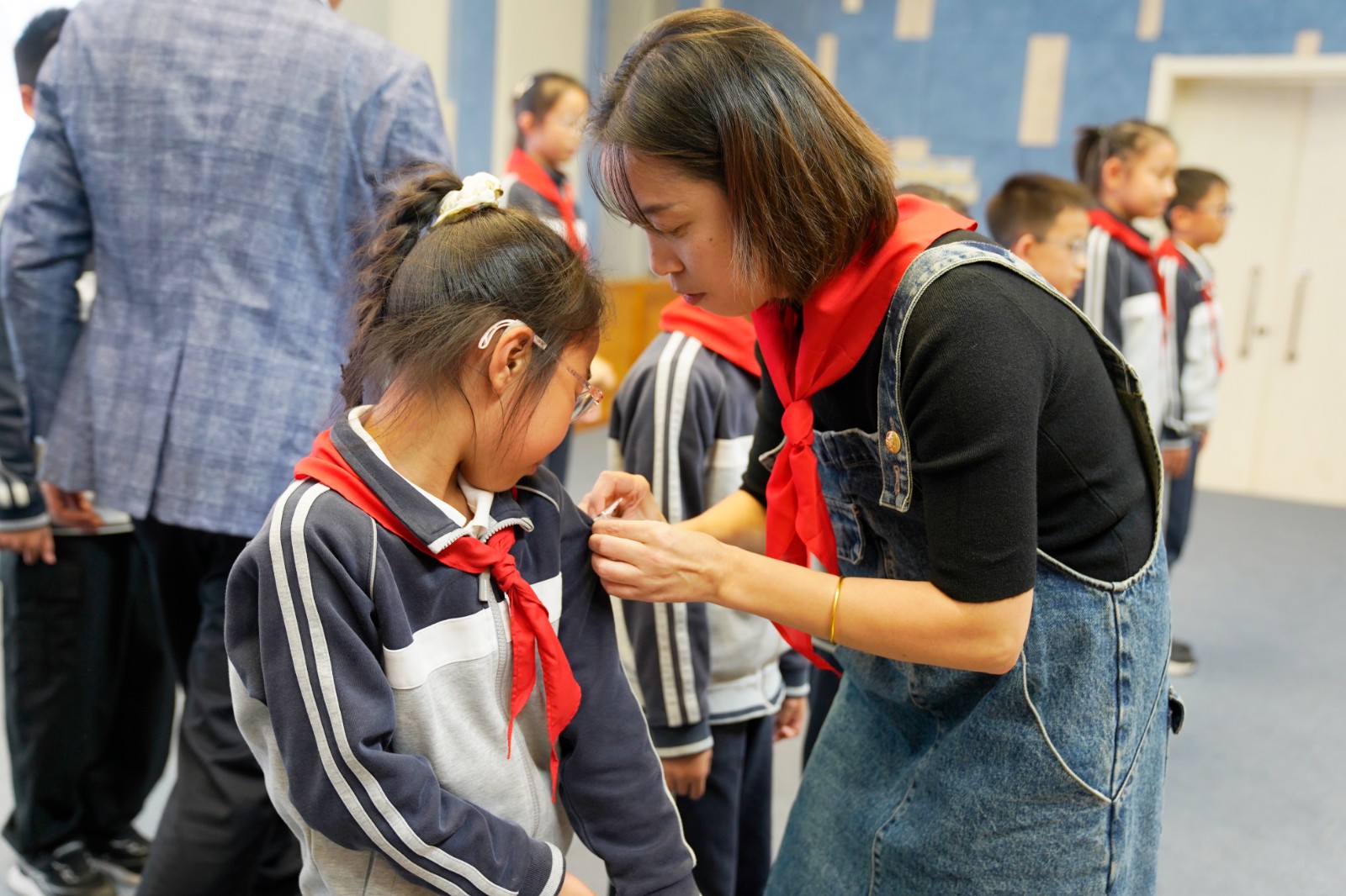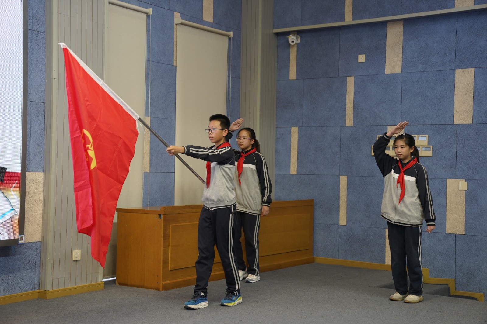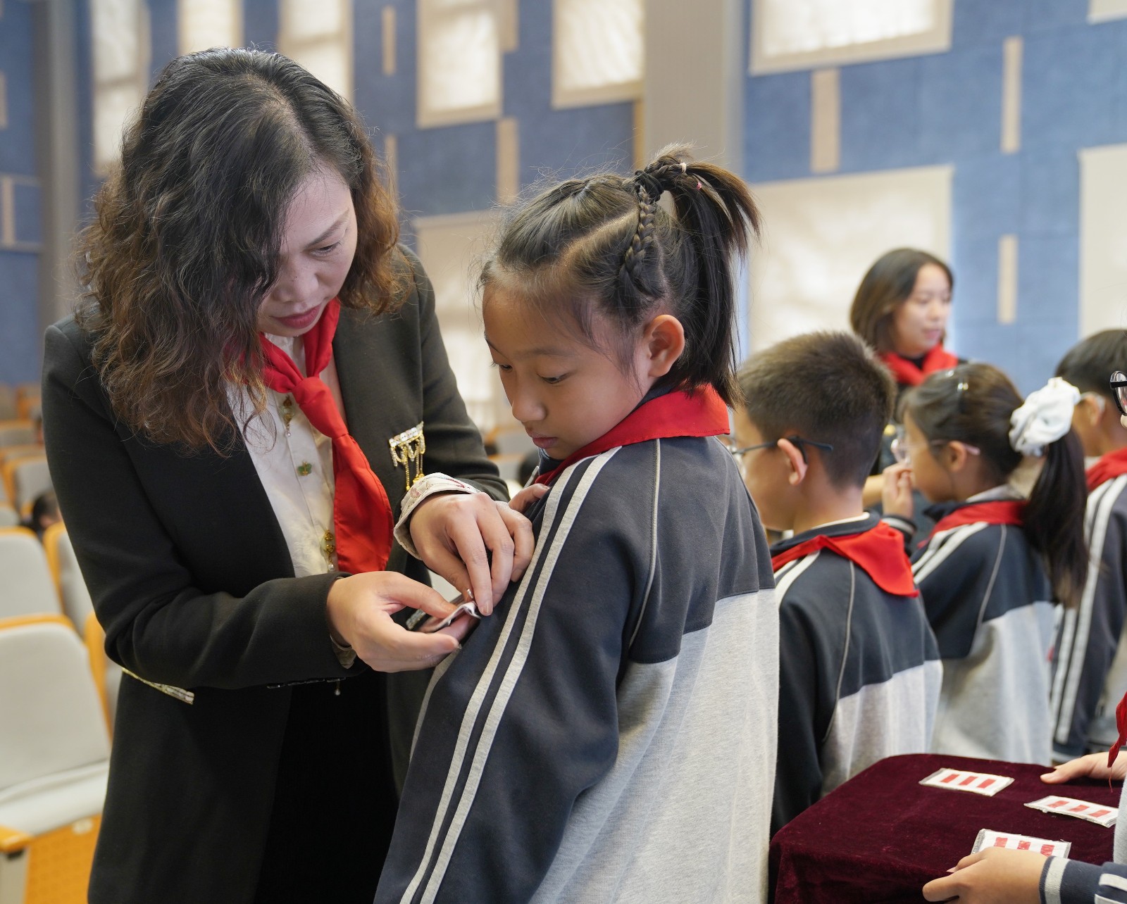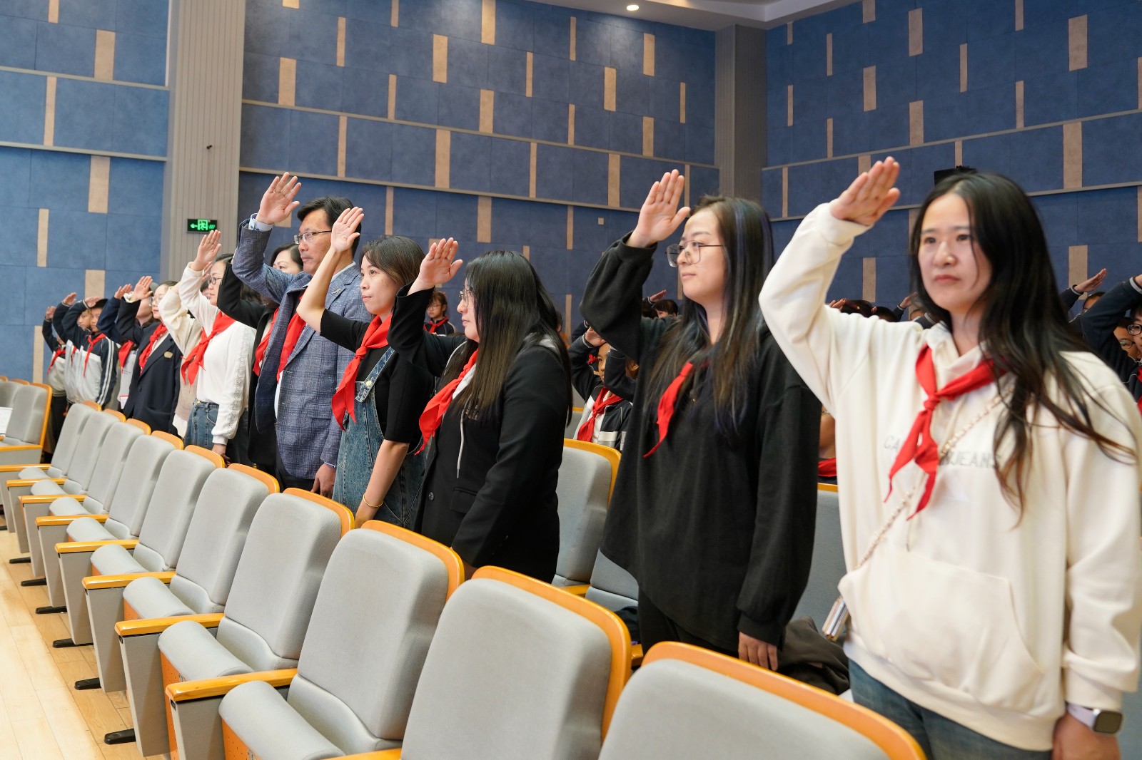 在全体代表的见证下,校长顾文荣、副校长刘萍、家委会副主任梁茜茜与服务保障部朱琰莉为新一届大队委员授予队标志,佩戴徽章的瞬间,责任与使命悄然传递。大队辅导员薛思豪带领新当选的大队委员面向队旗庄严宣誓,铿锵有力的誓言表达了他们服务同学、奉献校园的坚定决心。