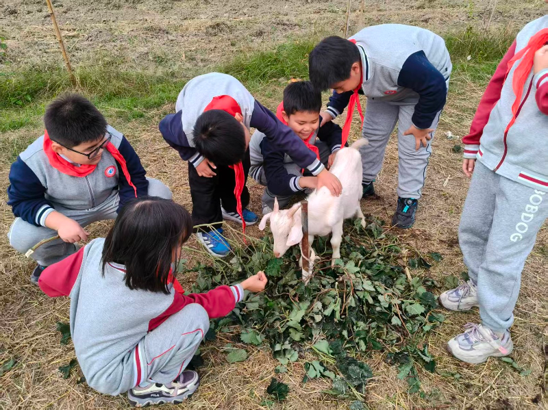 稻田边,同学们学习割稻、打谷的传统农耕技能。在老农民的指导下,大家手握镰刀,体验“谁知盘中餐,粒粒皆辛苦”的深刻内涵;石磨磨粉区,同学们两三人一组,合力推动石磨,看着米粒变成雪白细腻的的米粉,纷纷感叹传统工艺的神奇。此外,喂养小羊、小兔的环节也深受同学们喜爱,大家拿着青草,近距离与小动物互动,感受生命的可爱。
