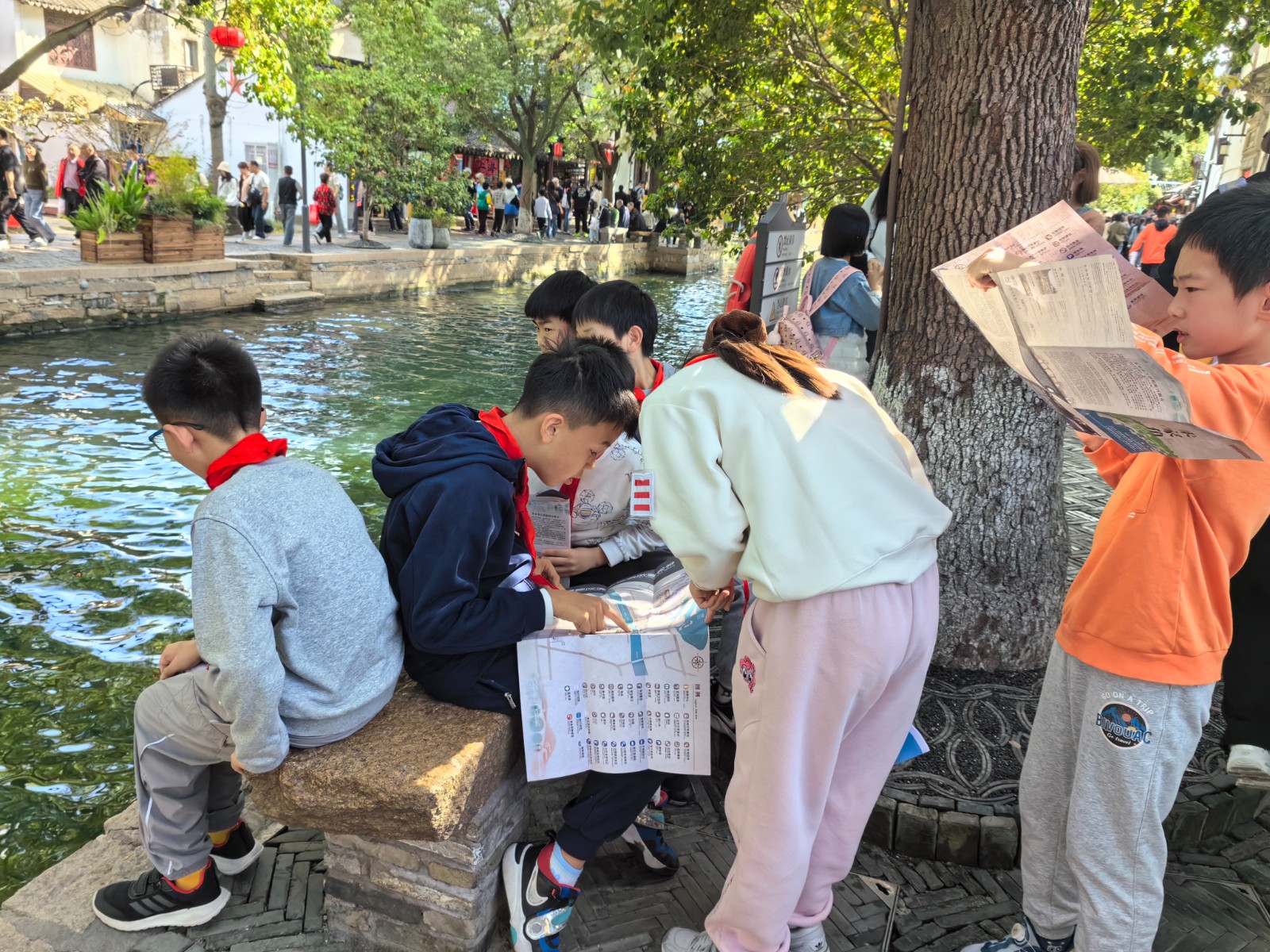 以小队为单位,手持地图,聘任家长辅导员,孩子们化身“小小探索家”。有的寻味江南,穿梭古街,品一碗阿婆粽、尝一块麦芽糖,在舌尖上读懂水乡风味;有的探幽访弄,钻进窄窄的“一人弄”,用脚步丈量历史的深邃;还有的驻足老店碑刻前,细细辨认斑驳文字,探寻古镇千年的文化密码。