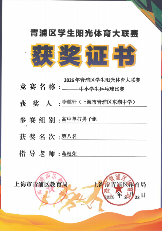 近日,2026年青浦区学生阳光体育大联赛中小学生乒乓球比赛圆满落幕,上海市青浦区东湖中学乒乓健儿奋勇拼搏、捷报频传,在团体和单打项目中均取得亮眼成绩,用汗水书写荣耀,为学校再添光彩!