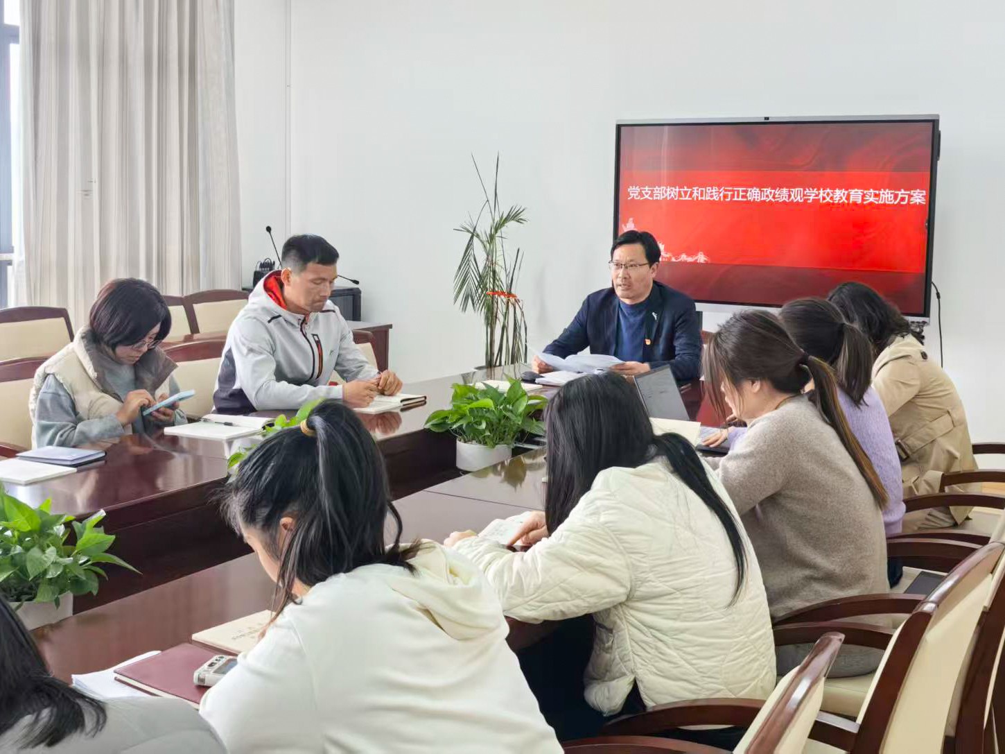 首先,由顾文荣书记详细解读《御澜湾学校党支部树立和践行正确政绩观学习教育实施方案》,明确2026年3月至7月为实施周期,围绕学习研讨、查摆剖析、整改整治、建章立制、开门教育、统筹推进、组织保障七个方面作出全面部署,推动正确政绩观学习教育走深走实。